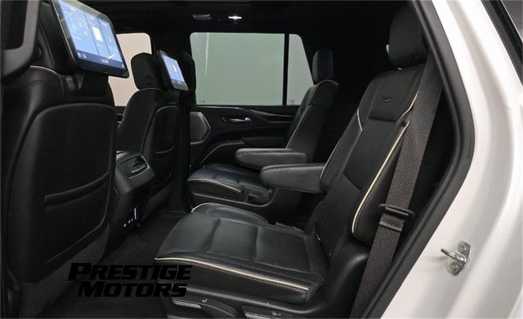 4WD, Black Leather, Adaptive Cruise Control, Air Ionizer, Air Ride Adaptive Suspension, AKG Studio 19-Speaker Audio System, Automatic Emergency Braking, Automatic Seat Belt Tightening, Body-Color Door Handles, Brake assist, Door Lock & Latch Shields, Driver Assist Tech Package, Electronic Cruise Control w/Set & Resume Speed, Electronic Limited-Slip Differential, Enhanced Automatic Emergency Braking, Enhanced Automatic Parking Assist, Glass Breakage Sensor, Hitch Guidance w/Hitch View, Illuminating Front & Rear Sill Plates, In-Vehicle Trailering System App, Integrated Trailer Brake Controller, Lane Keep Assist w/Lane Departure Warning, Navigation System, Power Liftgate, Power Panoramic Tilt-Sliding Sunroof, Preferred Equipment Group 1SC, Rear Camera Mirror, Rear Camera Mirror Washer, Rear Cross Traffic Alert, Rear Seat Entertainment System, Reconfigurable Full-Color Head-Up Display, Reverse Automatic Braking, Running Board Assist Steps, Soft Closing Front & Rear Doors, Theft-Deterrent Alarm System, Trailer Side Blind Zone Alert, Vehicle Inclination Sensor, Vehicle Interior Movement Sensor, 16.9" Diagonal OLED Infotainment Screen, 19 Speakers, 2-Presets Memory For Driver Seat Adjuster, 3.23 Axle Ratio, 3rd row seats: split-bench, 4-Way Power Driver Lumbar Seat Adjuster, 4-Way Power Front Passenger Lumbar Seat Adjuster, 4-Wheel Disc Brakes, 8-Way Power Driver Seat Adjuster, 8-Way Power Front Passenger Seat Adjuster, ABS brakes, Adaptive suspension, Air Conditioning, AKG Studio Reference 36-Speaker Audio System, Alloy wheels, AM/FM radio: SiriusXM with 360L, Apple CarPlay/Android Auto, Audio memory, Auto High-beam Headlights, Auto tilt-away steering wheel, Auto-dimming door mirrors, Auto-dimming Rear-View mirror, Automatic temperature control, Bumpers: body-color, Compass, Delay-off headlights, Driver door bin, Driver vanity mirror, Dual front impact airbags, Dual front side impact airbags, Electronic Stability Control, Emergency communication system: OnStar and Cadillac connected services capable, Four wheel independent suspension, Front anti-roll bar, Front Bucket Seats, Front Center Armrest w/Storage, Front dual zone A/C, Front reading lights, Fully automatic headlights, Garage door transmitter, Gloss Black Escalade Nameplate (LPO), HD Radio, Heads-Up Display, Heated & Ventilated Driver & Front Passenger Seats, Heated door mirrors, Heated Driver & Front Passenger Seats, Heated front seats, Heated rear seats, Heated steering wheel, Illuminated entry, Leather Seating Surfaces w/Precision Perf Inserts, Leather steering wheel, Low tire pressure warning, Magnetic Ride Control Suspension, Memory seat, Monochrome Cadillac Emblems (LPO), Occupant sensing airbag, Outside temperature display, Overhead airbag, Overhead console, Panic alarm, Passenger door bin, Passenger vanity mirror, Power door mirrors, Power driver seat, Power moonroof, Power passenger seat, Power steering, Power windows, Power-Retractable Assist Steps, Puddle Lamps w/Cadillac Crest (LPO), Radio data system, Radio: AM/FM/SiriusXM w/Navigation, Rain sensing wipers, Rear air conditioning, Rear anti-roll bar, Rear reading lights, Rear window defroster, Rear window wiper, Remote keyless entry, Roof rack: rails only, Security system, SiriusXM w/360L, Speed control, Split folding rear seat, Spoiler, Steering wheel memory, Steering wheel mounted audio controls, Tachometer, Teen Driver, Telescoping steering wheel, Tilt steering wheel, Traction control, Trip computer, Turn signal indicator mirrors, Variably intermittent wipers, Ventilated front seats, Voltmeter, Wheels: 22" 12-Spoke Polished Alloy, Wireless Apple CarPlay/Wireless Android Auto, Remote start, Panormaic Moonroof, Must see, 3 Month or 3,000 Mile Powertrain Warranty Included, REAR DVD, PANO ROOF, 4WD, Black Leather, Adaptive Cruise Control, Air Ionizer, Air Ride Adaptive Suspension, AKG Studio 19-Speaker Audio System, Automatic Emergency Braking, Automatic Seat Belt Tightening, Body-Color Door Handles, Brake assist,