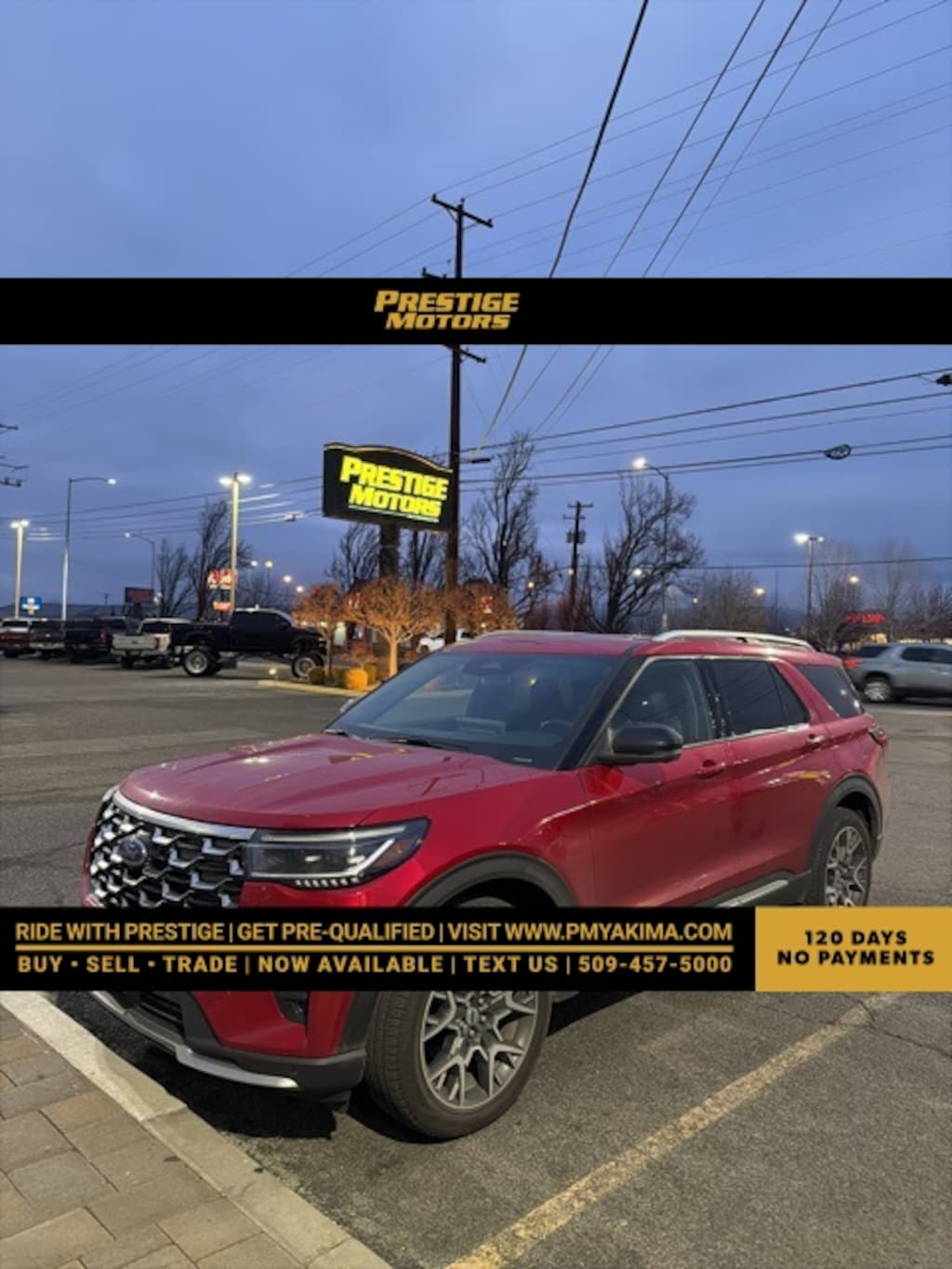 Family owned and operated, We have been in business for over 15 years and have developed a loyal and dedicated following based on our unique approach to business. Every car is completely inspected, reconditioned and detailed to our extremely high standards. We proudly serve the Yakima Valley, Tri-Cities area and the entire Pacific Northwest. We utilize an independent third party software company to thoroughly shop every car in our inventory against every other similar vehicle in the market to ensure we are always competitively priced. We treat all our customers like family and we look forward to making you part of ours! #RideWithPrestige. Why choose us? Quality, Trust, Service & Selection! Offering quality & fully reconditioned pre-owned Cars, Trucks, Vans, & SUVS to the entire Pacific Northwest! At Prestige Motors Inc not only will you find an entire line up of the best quality pre-owned vehicles around, and you will also find a friendly & accommodating staff eager to assist you. We know you have high expectations when shopping for your next vehicle, we enjoy the challenge of meeting & exceeding those expectations each & every time. #RideWithPrestige.